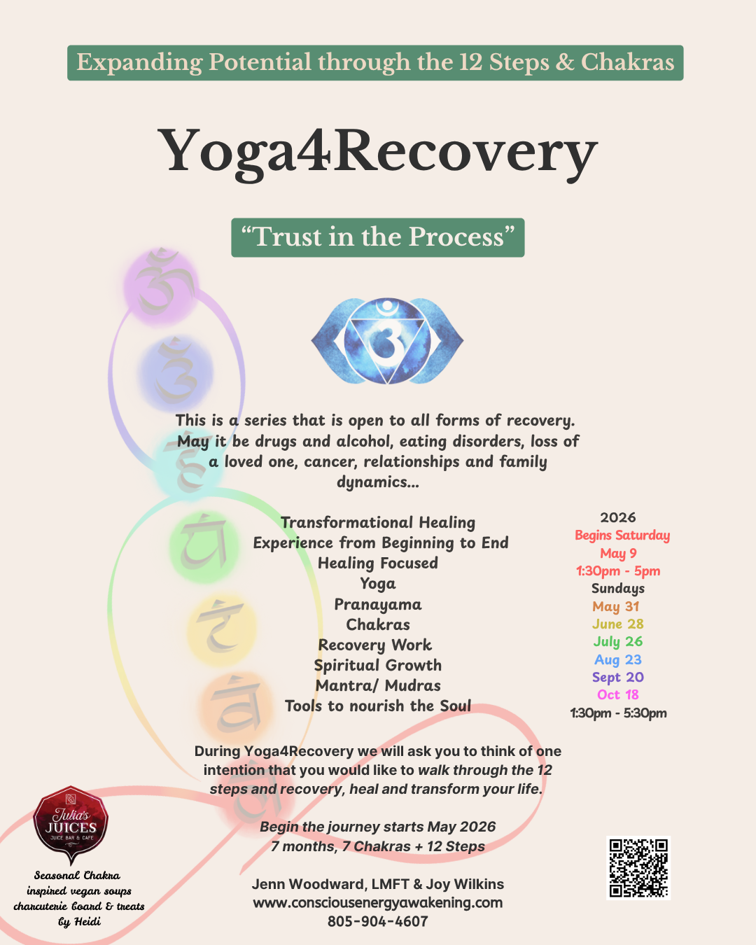 One of the leading focuses of Ypga4Recovery is expanding our potential as we work through the 7 Chakras in alignment with the specific steps of Yoga4Recovery Program. The Chakra system is widely used along side many practices, We will uncover, discover, discard as we merge and drop into our physical body. Each month the series layers the seven Chakras, yoga and 12 steps.