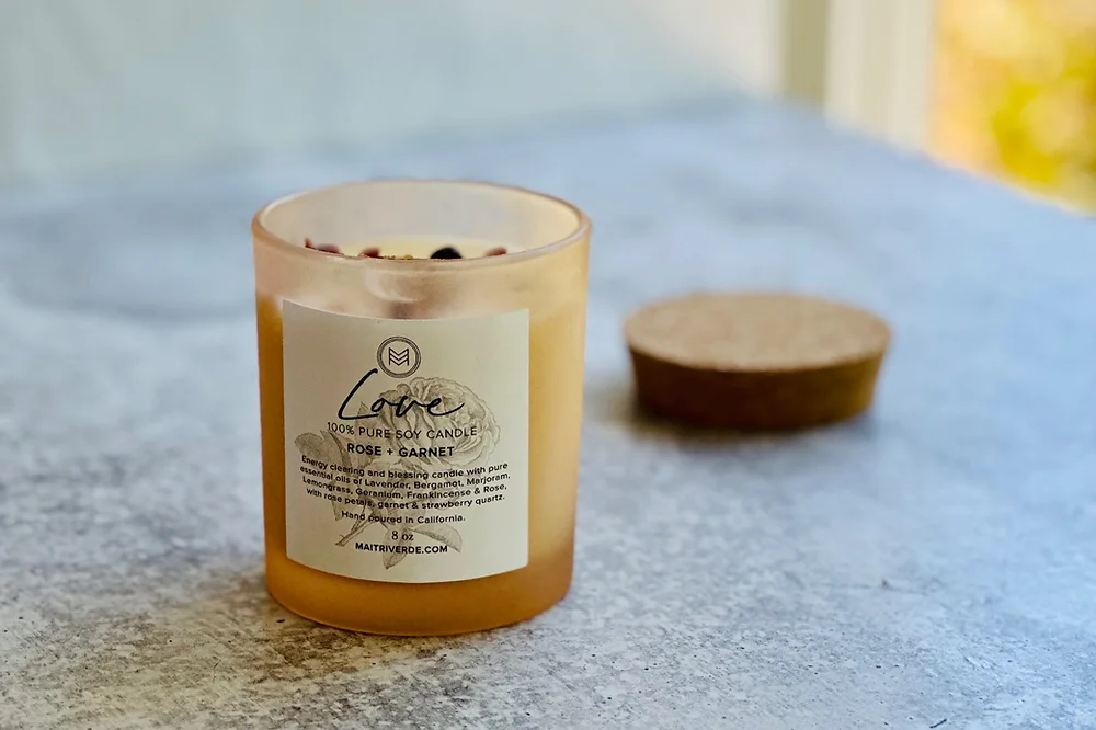 Maitri Verde's Love Candle is a 94% organic soy wax and 6% of pure organic essential oils of Maroccan Rose (Rosa x damascena), Lavandin (Lavandula x intermedia) , Bergamot (Citrus aurantium var. bergamia) , Marjoram (Origanum majorana), Lemongrass (Cymbopogon flexuosus), Egyptian Geranium (Pelargonium graveolens), Frankincense (Boswellia frereana), an organic eco wick, rose petals and crystal chips of garnet and strawbery quartz.